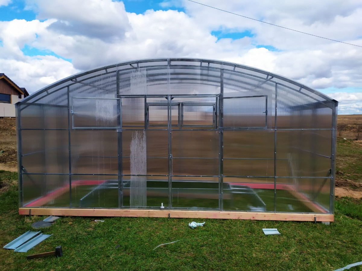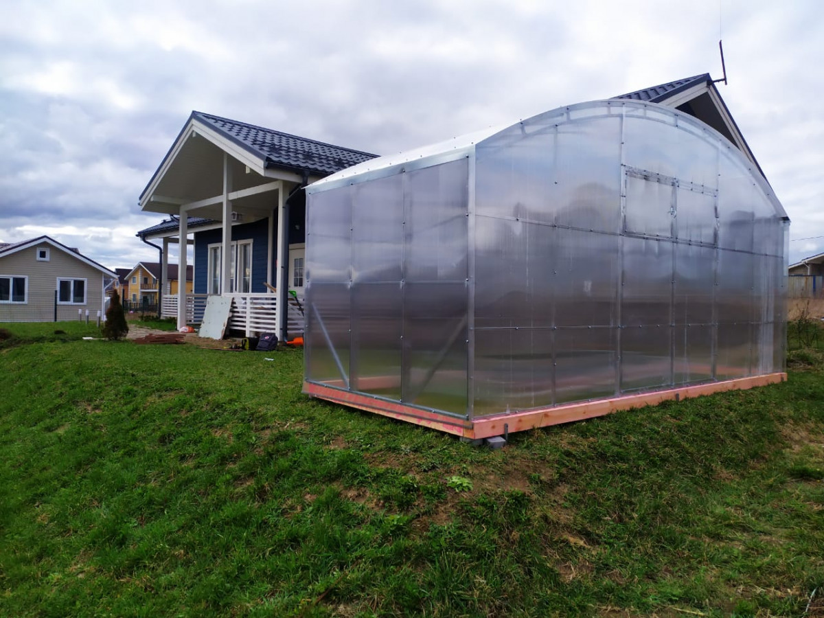 Возможна самостоятельная сборка по подробной инструкции. Сборка теплицы монтажниками-профессионалами компании занимает порядка 5 часов. В качестве основания рекомендуется использовать бетонный, либо деревянный фундамент из бруса. Предварительно брус необходимо обработать антисептиком. Полный комплект состоит из: